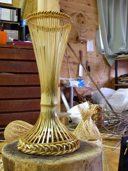 その後、いくつか他のプロジェクトを行うも竹への想いは途切れなかった、二年前に帰国し、八木澤正先生を訪ねた際に一つの花籠に出会う。それは一本の竹からなるもので、その美しさに惹かれた。ここに照明の機能を持たせることはできないだろうか?